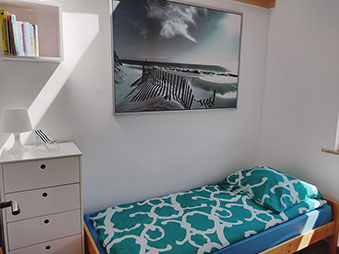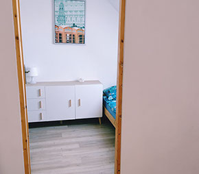 Dwie niezależne sypialnie wyposażone są w wygodne łóżka, meble do przechowywania odzieży oraz małą biblioteczkę. W sypialni na parterze znajduje się łóżko o wymiarach 90x200, natomiast na piętrze do Państwa dyspozycji oddajemy trzy łóżka w tym jedno o wymiarach 140x200 oraz dwa 90x200.