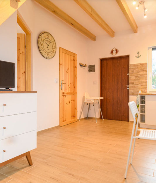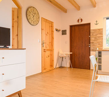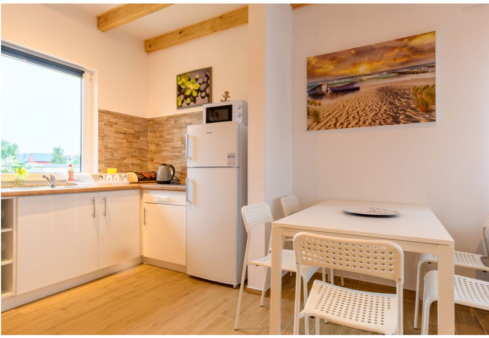 Dom wolnostąjacy o powierzchni 64 m kw, który posiada w pełni wyposażoną kuchnie w płytę elektryczną, lodówkę, czajnik, komplet garnków i patelni, naczynia, sztućce, sprzęt potrzebny do przygotowania posiłków oraz mikrofale.
