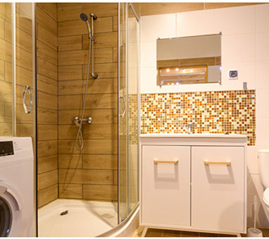 Łazienka wyposażona jest w kabinę prysznicową, WC, nowoczesną pralkę o obrotach 1200 oraz suszarkę stojącą na bieliznę.