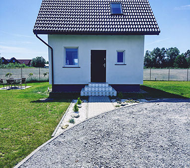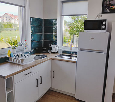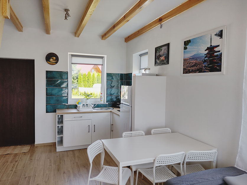 Dom wolnostąjacy o powierzchni 64 m kw, który posiada w pełni wyposażoną kuchnie w płytę elektryczną, lodówkę, czajnik, komplet garnków i patelni, naczynia, sztućce, sprzęt potrzebny do przygotowania posiłków oraz mikrofale.