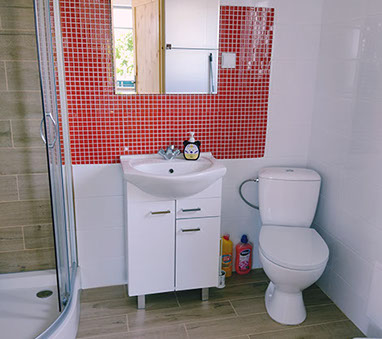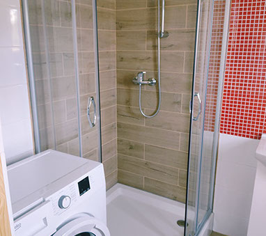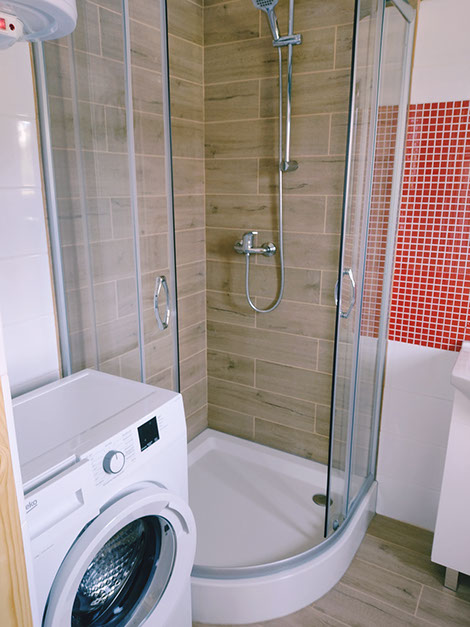 Łazienka wyposażona jest w kabinę prysznicową, WC, nowoczesną pralkę o obrotach 1200 oraz suszarkę stojącą na bieliznę.
