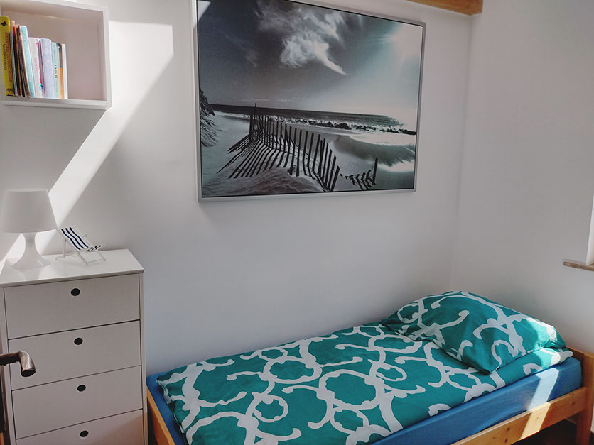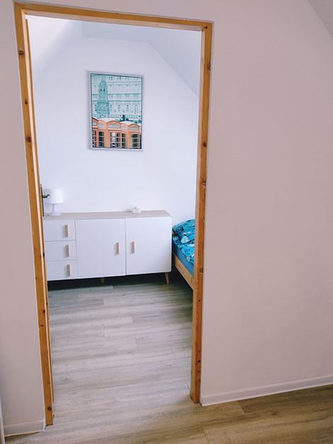 Dwie niezależne sypialnie wyposażone są w wygodne łóżka, meble do przechowywania odzieży oraz małą biblioteczkę. W sypialni na parterze znajduje się łóżko o wymiarach 90x200, natomiast na piętrze do Państwa dyspozycji oddajemy trzy łóżka w tym jedno o wymiarach 140x200 oraz dwa 90x200.
