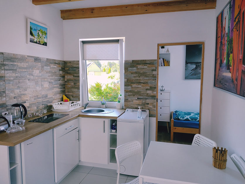 Na wyposażeniu słonecznej i dużej kuchni jest płyta elektryczna, lodówka, czajnik, komplet garnków i patelni, naczynia, sztućce oraz sprzęt potrzebny do przygotowania posiłków.