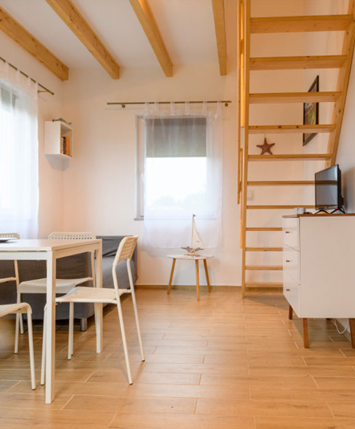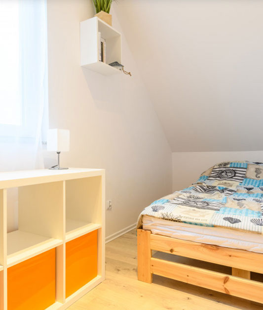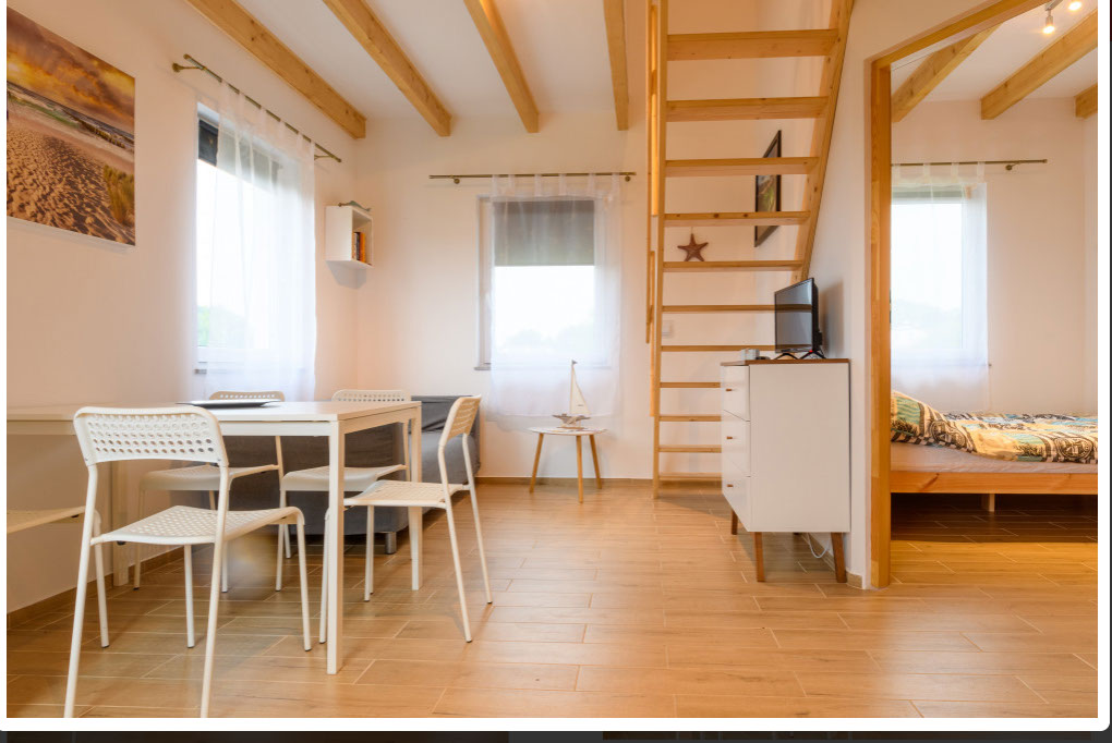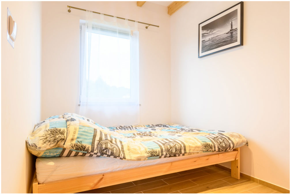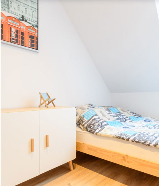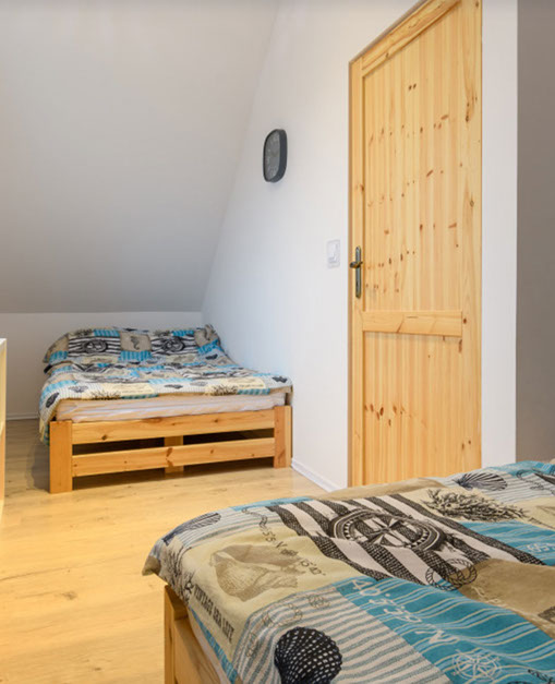 Zaletą domu są trzy niezależne sypialnie wyposażone w fantastyczne łóżka, meble do przechowywania odzieży oraz małą biblioteczkę. Jedna sypialnia znajduje się na parterze i wyposażona jest w wygodne małżeńskie łóżko o wymiarach 140X200. Dwie kolejne sypialnie na piętrze posiadają cztery łóżka o wymiarach 140x200