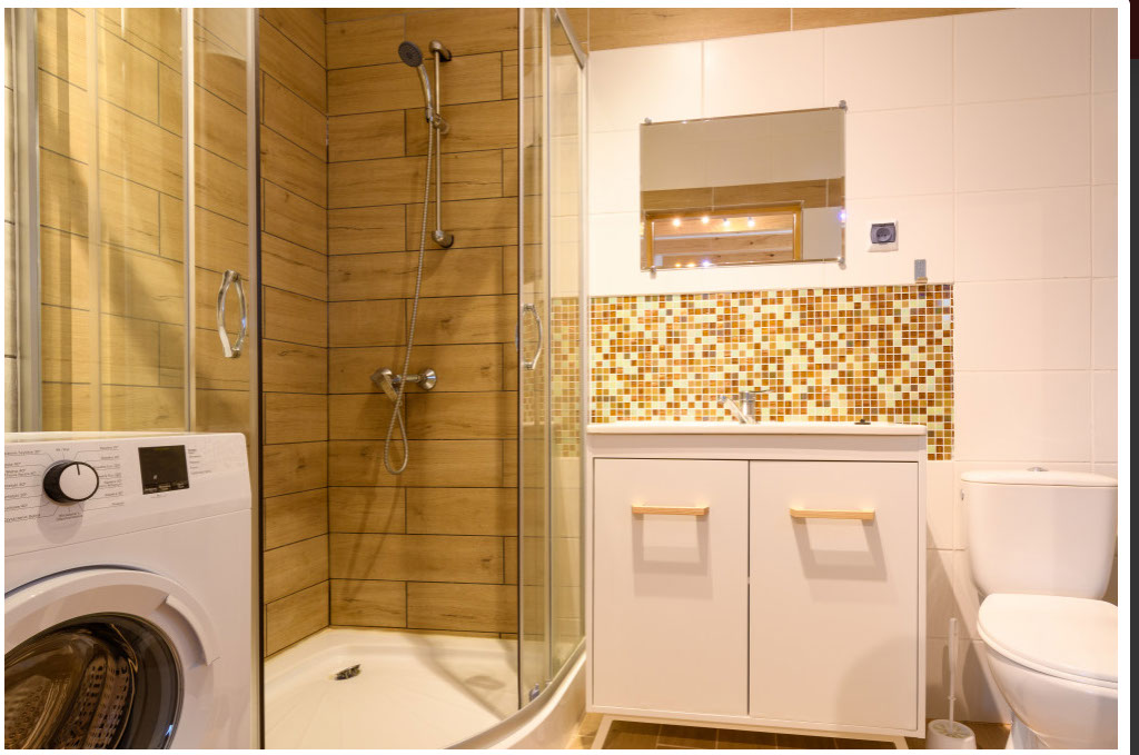 Łazienka wyposażona jest w kabinę prysznicową, WC, nowoczesną pralkę o obrotach 1200 oraz suszarkę stojącą na bieliznę.