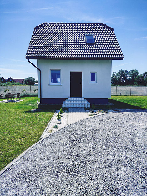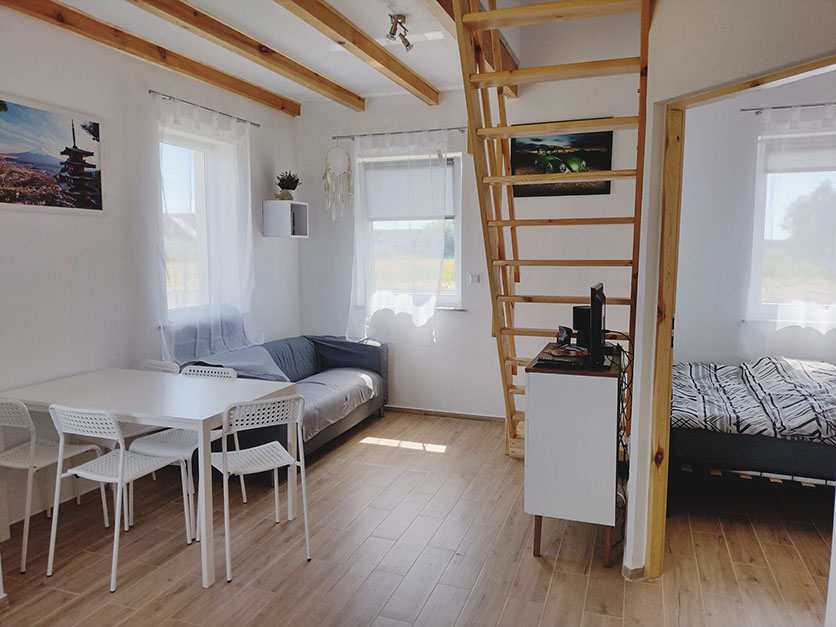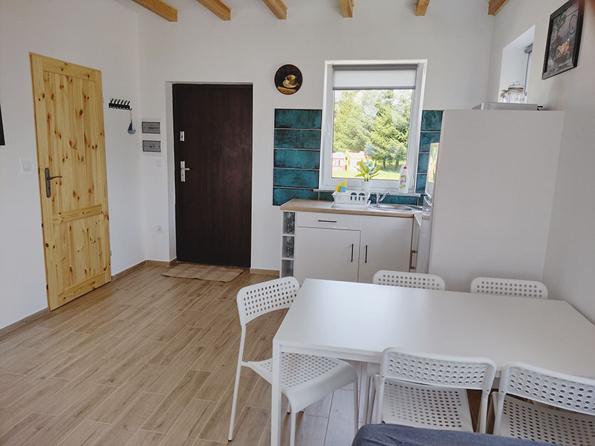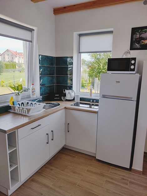 Dom wolnostąjacy o powierzchni 64 m kw, który posiada w pełni wyposażoną kuchnie w płytę elektryczną, lodówkę, czajnik, komplet garnków i patelni, naczynia, sztućce, sprzęt potrzebny do przygotowania posiłków oraz mikrofale.