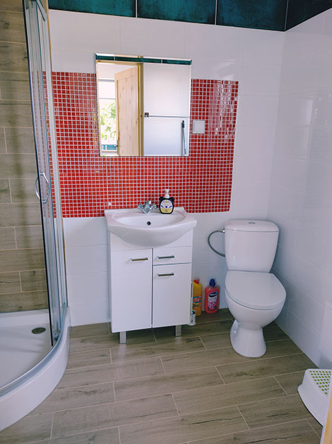 Łazienka wyposażona jest w kabinę prysznicową, WC, nowoczesną pralkę o obrotach 1200 oraz suszarkę stojącą na bieliznę.