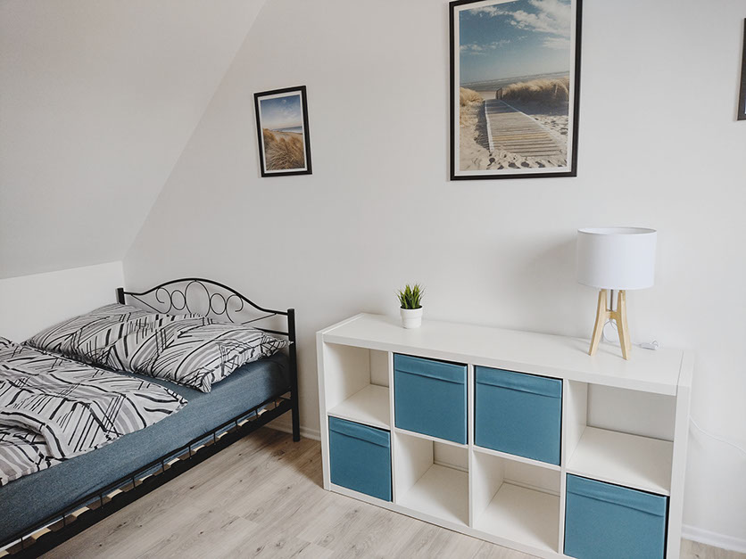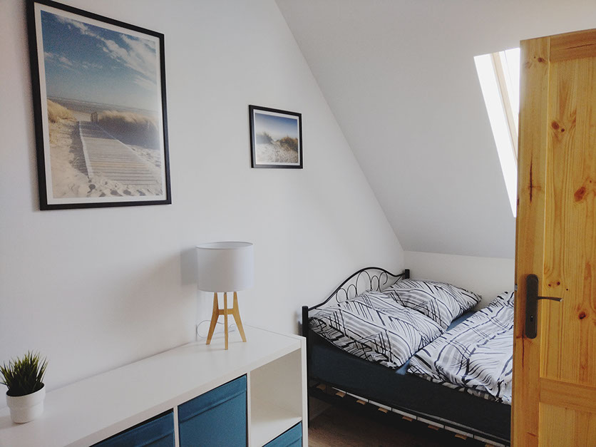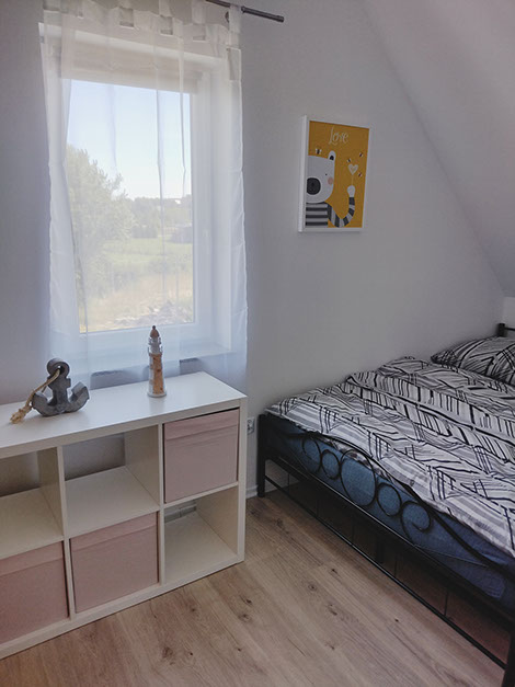 Zaletą domu są trzy niezależne sypialnie wyposażone w fantastyczne łóżka, meble do przechowywania odzieży oraz małą biblioteczkę. Jedna sypialnia znajduje się na parterze i wyposażona jest w wygodne małżeńskie łóżko o wymiarach 140X200. Dwie kolejne sypialnie na piętrze posiadają cztery łóżka o wymiarach 140x200