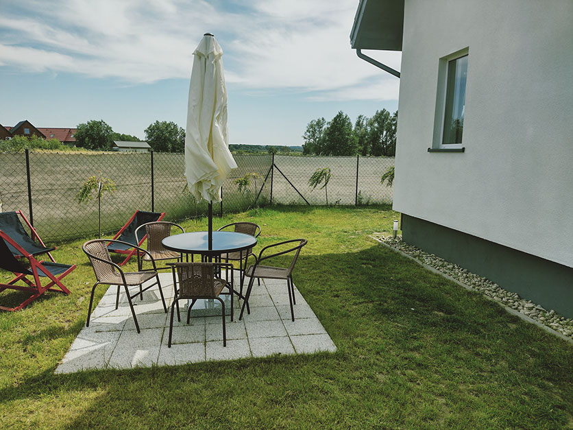 Dom posiada stół ogrodowy wraz z krzesłami, parasol przeciwsłoneczny oraz duży grill.